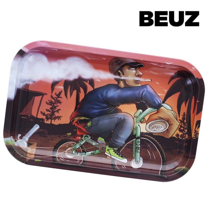 Le plateau à rouler Beuz Bike Print XL se distingue par son design urbain unique mettant en scène un rider stylisé dans un décor de coucher de soleil. Fabriqué en métal résistant, ce plateau grand format offre une surface de préparation généreuse avec ses bords relevés anti-débordement.