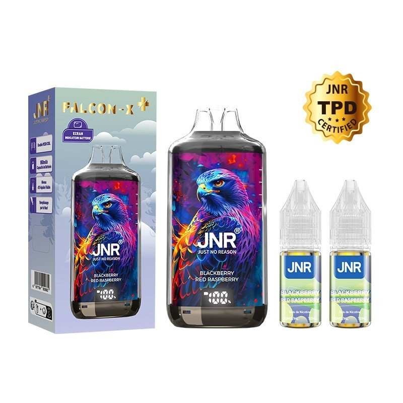 Le Puff Falcon-X Plus 28K JNR se démarque par son design élégant et ses performances exceptionnelles. Cette cigarette électronique jetable arbore un style moderne avec son motif d'aigle coloré sur fond violet et bleu. Le dispositif est livré avec deux flacons de e-liquide aux saveurs intenses de mûre et framboise rouge.